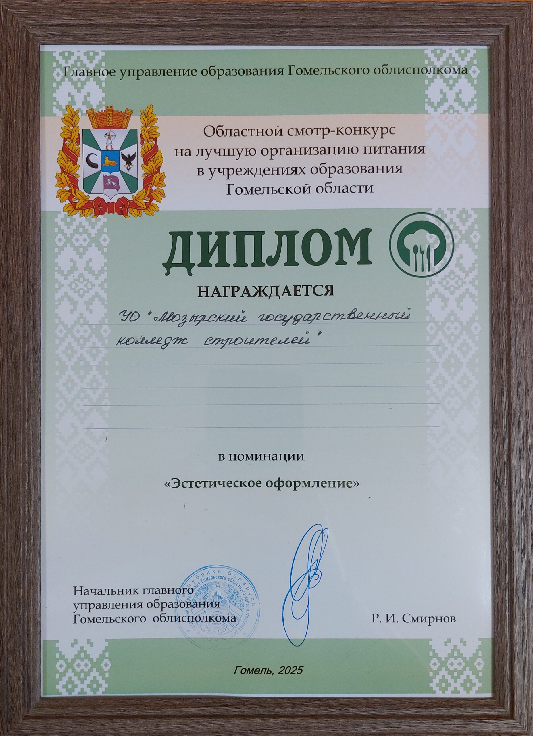 В областном смотр-конкурсе на лучшую организацию питания в учреждениях образования Гомельской области дипломом награждается УО «Мозырский государственный колледж строителей» в номинации «Эстетическое оформление»