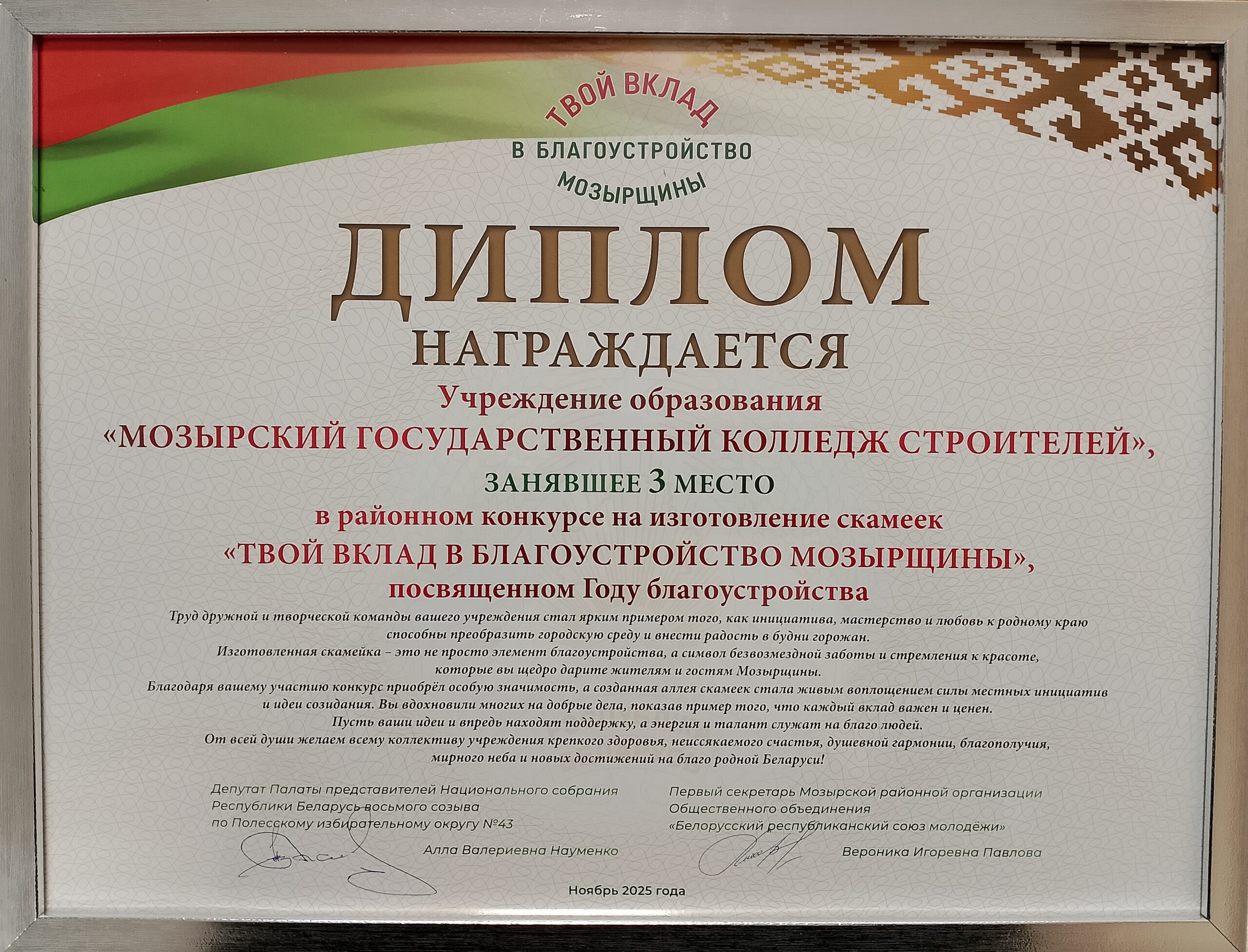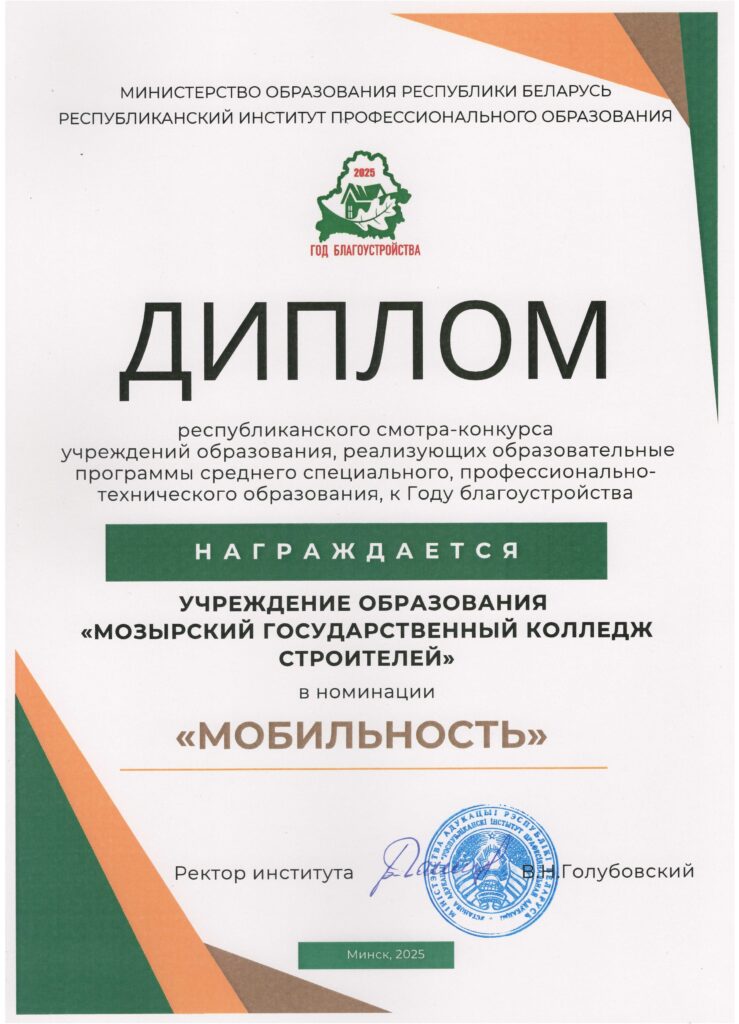 Дипломом республиканского смотра-конкурса учреждений образования, реализующих образовательные программы среднего специального, профессионально-технического образования, к Году благоустройства награждается УО «Мозырский государственный колледж строителей» в номинации «Мобильность»