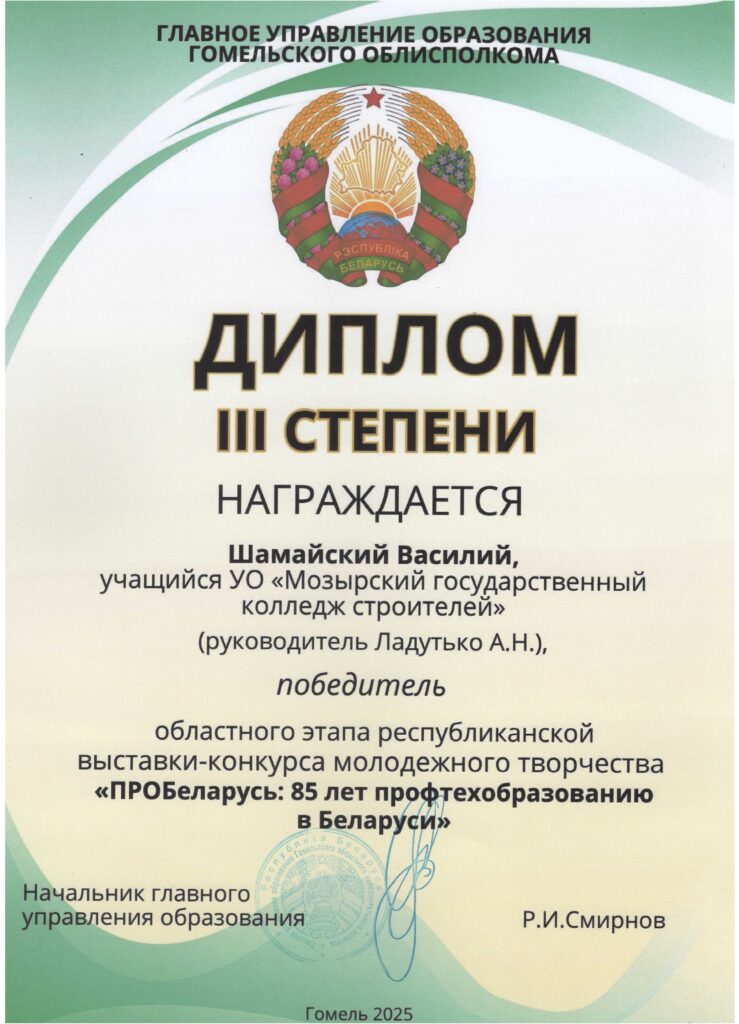 Дипломом III степени награждается учащийся Шамайский Василий (руководитель Ладутько А.Н.) победитель областного этапа республиканской выставки-конкурса молодежного творчества «ПРОБеларусь: 85 лет профтехобразованию в Беларуси».