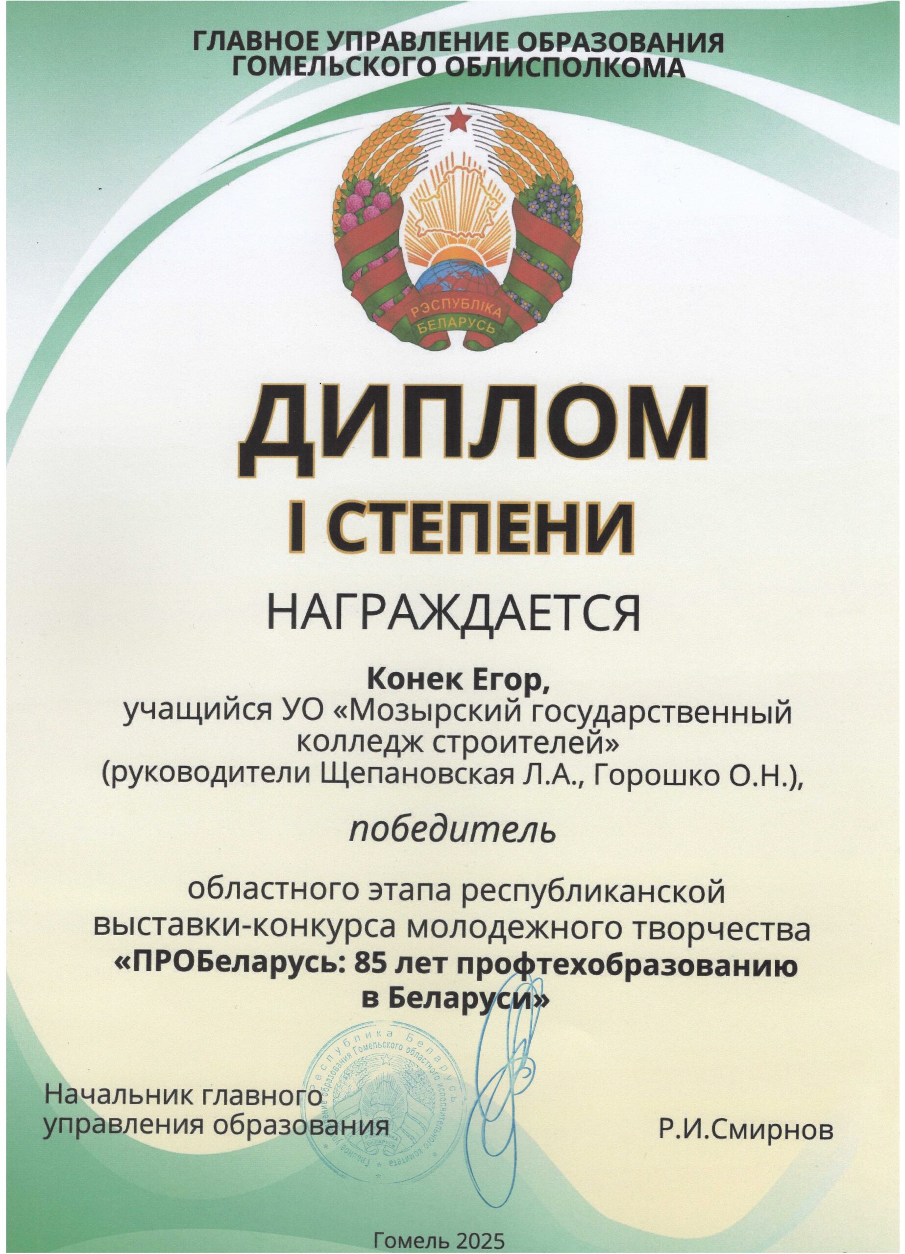 Дипломом I степени награждается учащийся Конек Егор (руководители Щепановская Л.А., Горошко О.Н.) победитель областного этапа республиканской выставки-конкурса молодежного творчества «ПРОБеларусь: 85 лет профтехобразованию в Беларуси».