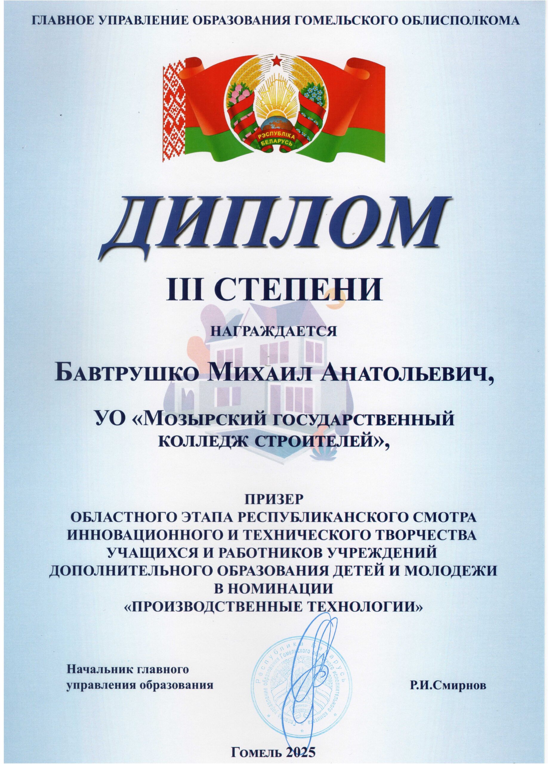 Дипломом III степени награждается Бавтрушко Михаил Анатольевич призер в областном этапе республиканского смотра инновационного и технического творчества учащихся и работников учреждений дополнительного образования детей и молодежи в номинации «Производственные технологии».