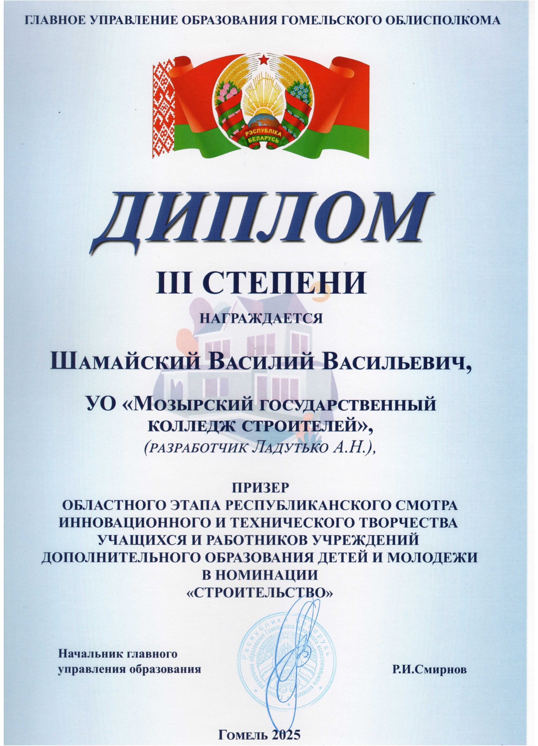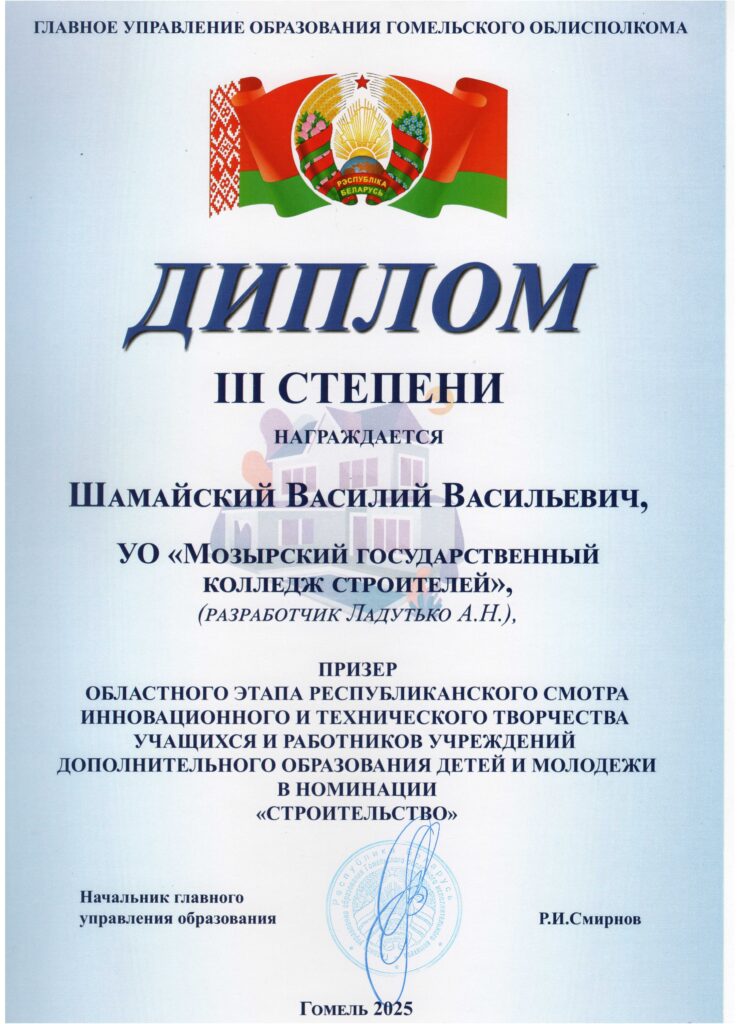 Дипломом III степени награждается Шумайский Василий Васильевич (разработчик Ладутько А.Н.) призер в областном этапе республиканского смотра инновационного и технического творчества учащихся и работников учреждений дополнительного образования детей и молодежи в номинации «Строительство».