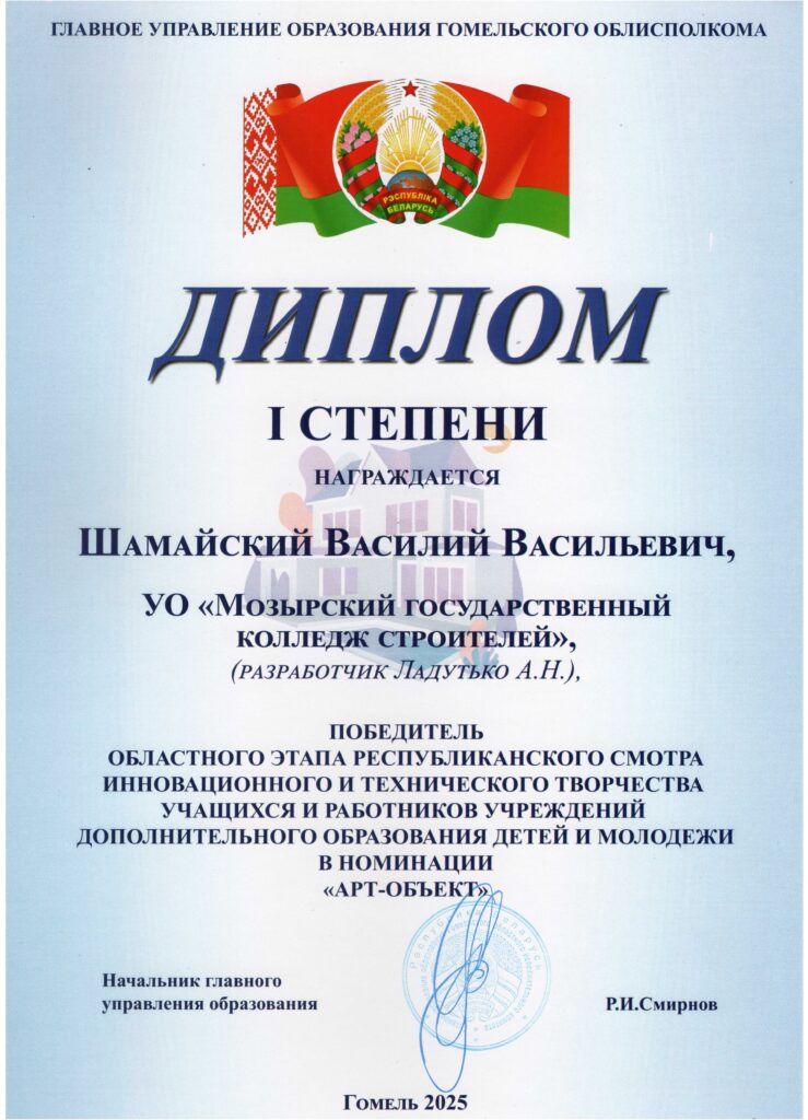 Дипломом I степени награждается Шумайский Василий Васильевич (разработчик Ладутько А.Н.) победитель в областном этапе республиканского смотра инновационного и технического творчества учащихся и работников учреждений дополнительного образования детей и молодежи в номинации «Арт-объект».