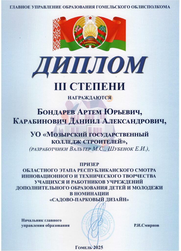 Дипломом III степени награждаются Бондарев Артем Юрьевич и Карабинович Даниил Александрович (разработчики Вальтер М.С., Шубенок Е.И.) призеры в областном этапе республиканского смотра инновационного и технического творчества учащихся и работников учреждений дополнительного образования детей и молодежи в номинации «Садово-парковый дизайн».