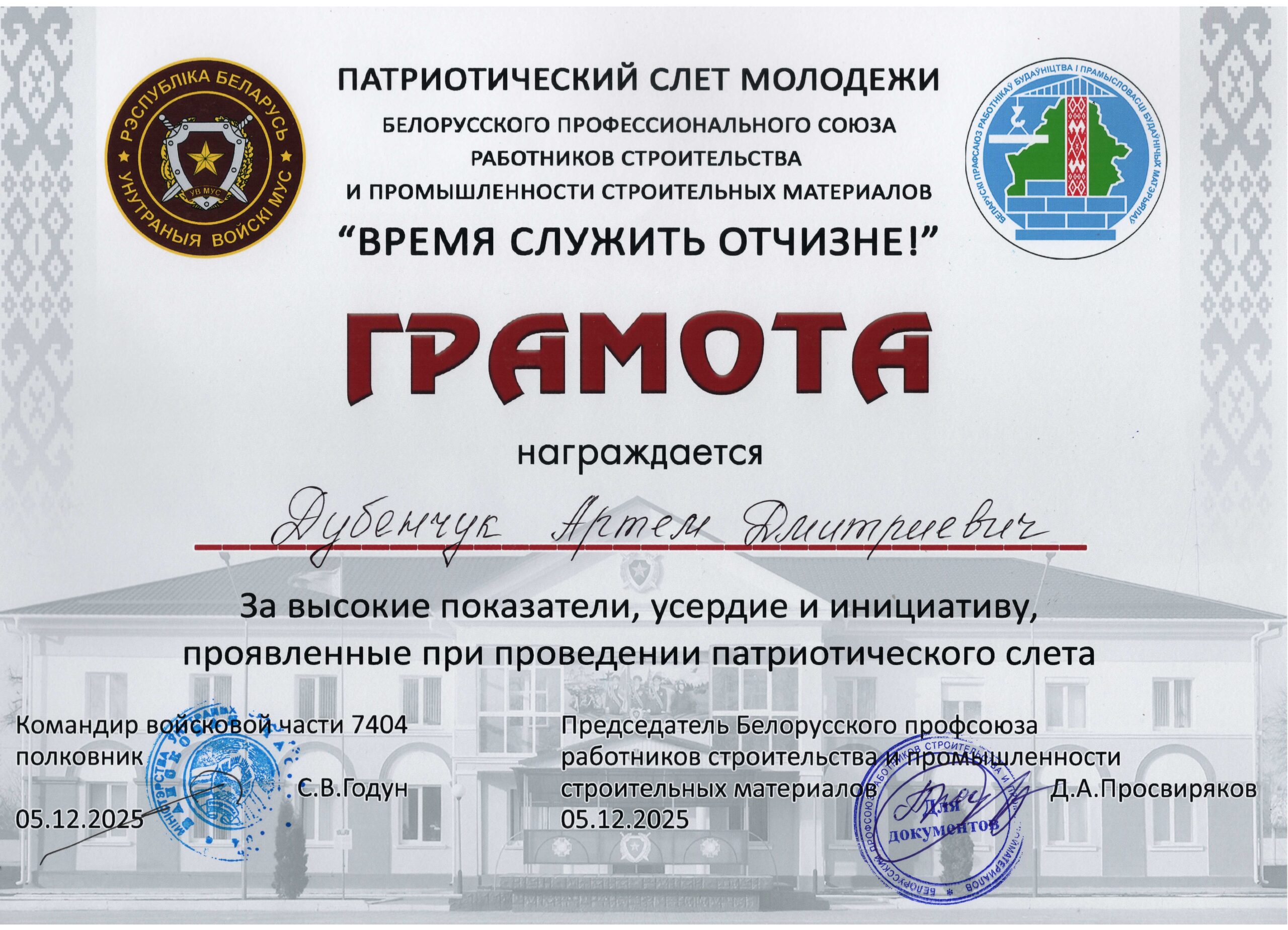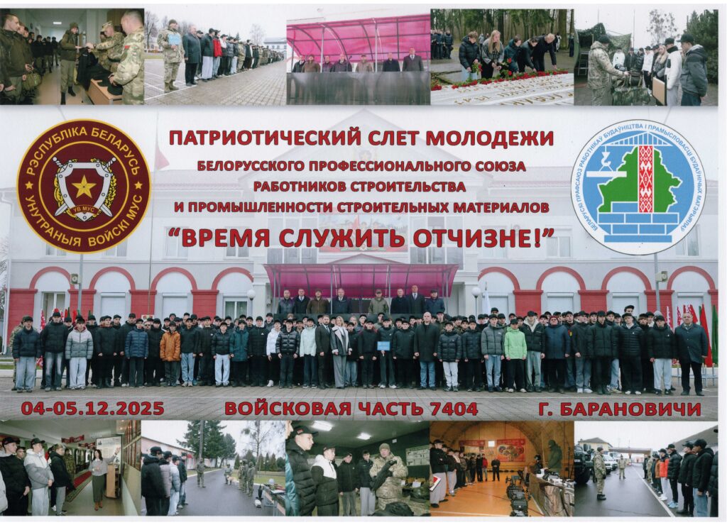 С 03.12.2025 по 05.12.2025 учащиеся колледжа под руководством руководителя по военно-патриотическому воспитанию Борисовца П.П. приняли участие в патриотическом слёте молодежи Белорусского профессионального союза работников строительства и промышленности строительных материалов «Время служить отчизне!».