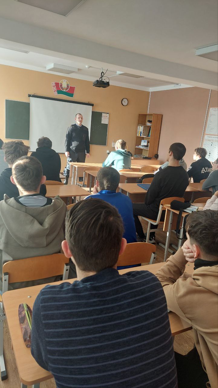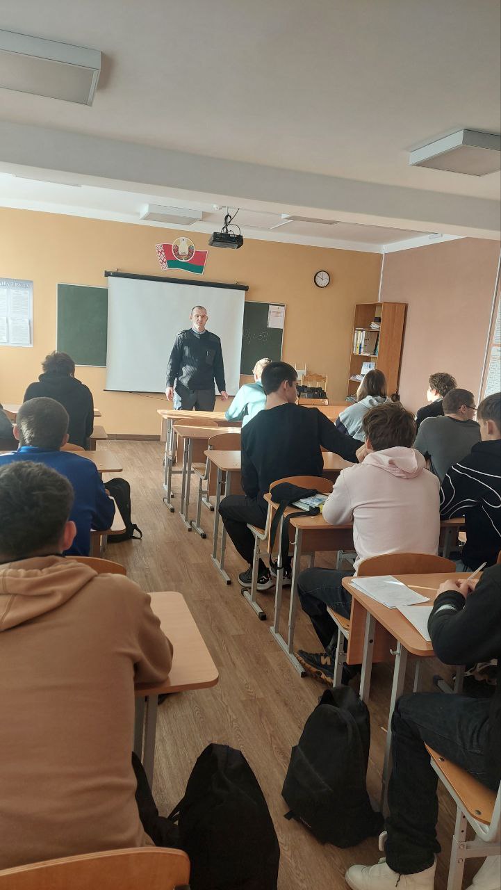 20.01.2026 участковый инспектор ИДН Квасницкий Ю.М. провел с учащимися беседу по профилактике правонарушений и преступлений среди несовершеннолетних. Профилактика наркомании, пьянства, кибербезопасности, экстремизма, терроризма. Разъяснены ст. 10.1, 11.1, 11.3, 19.1-19.11 КоАП РБ, а также ст.205-209, 212, 222, 328, 339-349, 351, 355 УК РБ.