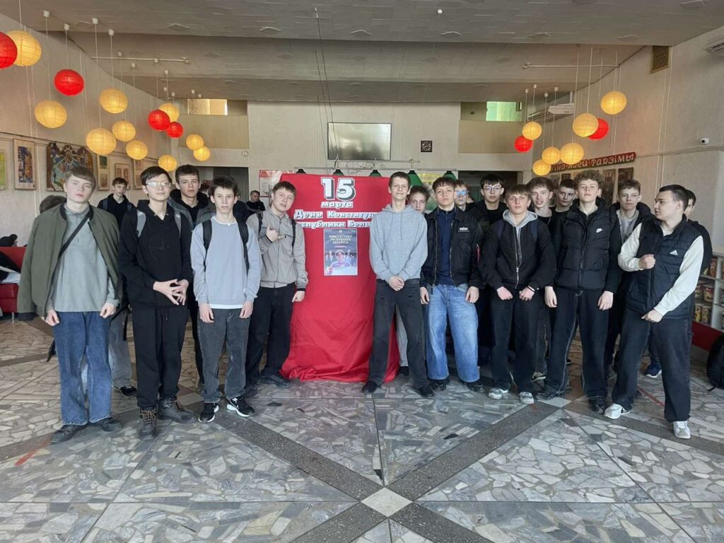 16.03.2026 учащиеся групп МЭГ-152, ОСР-133, ПБМ-11 посетили кинопоказ нового художественно-документального фильма «Конституция Республики Беларусь» национальной киностудии «Беларусьфильм» кинорежиссера Евгения Шлеменкова, приуроченного ко Дню Конституции РБ.
