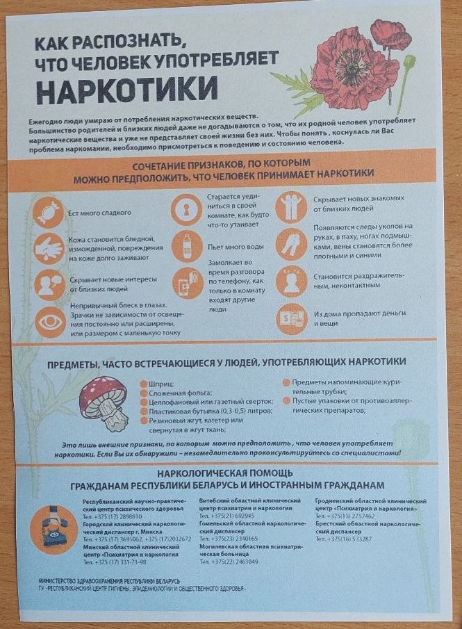 08.04.2026 в группе ПБМ-11 психологом Мозырского ЗЦГЭ Исаенко В.Б. была проведена профилактическая беседа «Профилактика наркотической зависимости среди несовершеннолетних».